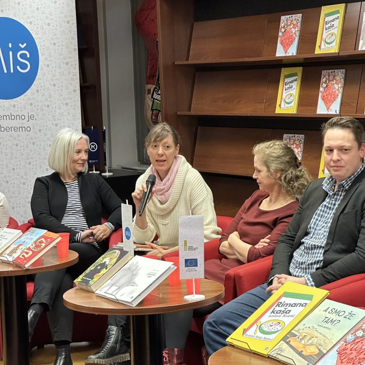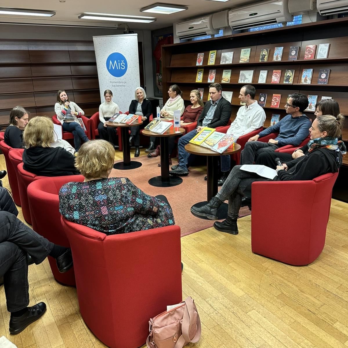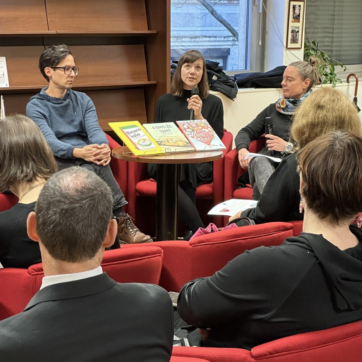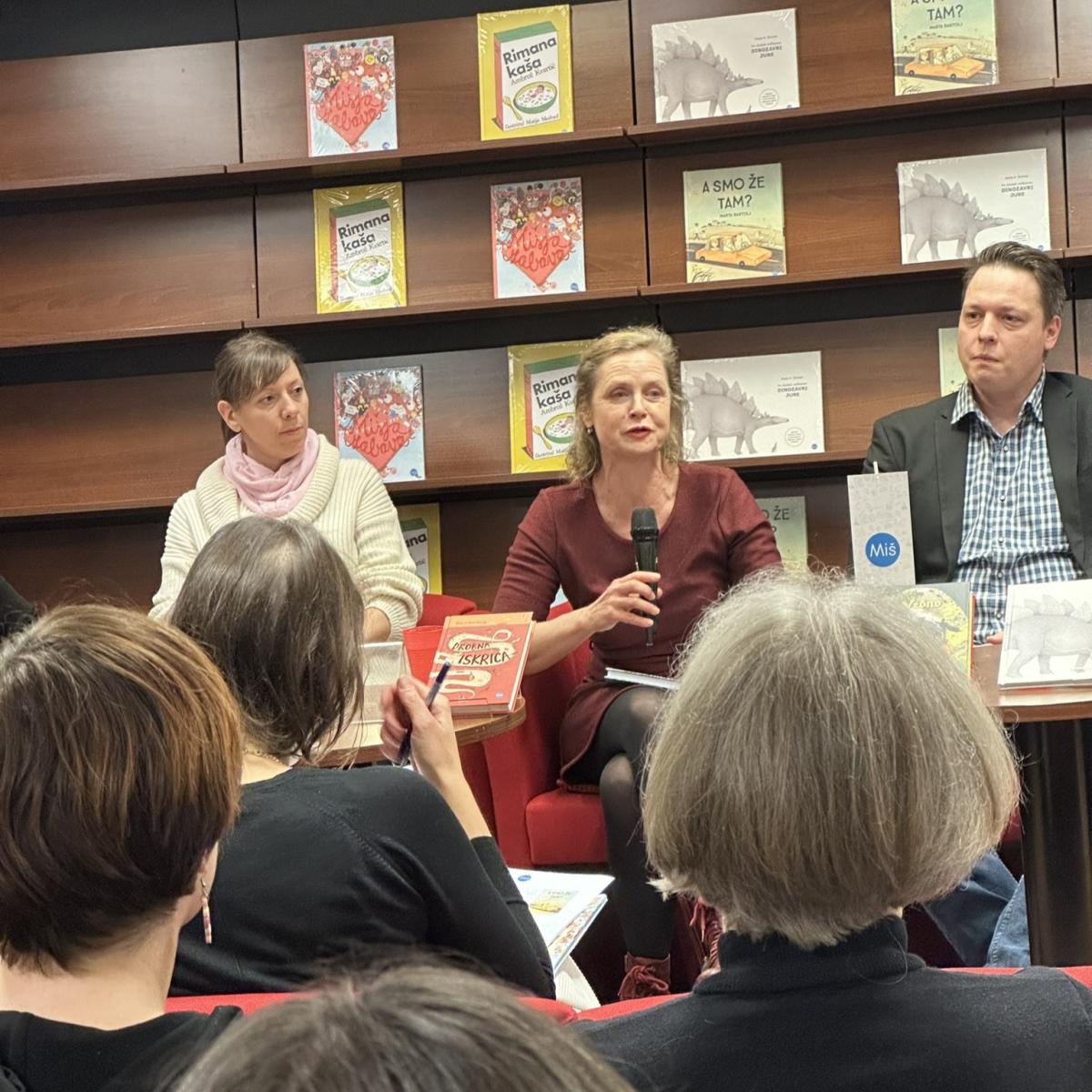 V sredo, 13. 12., sta v knjigarni Konzorcij urednici Gaja Kos in Nika Susman gostili Natašo Konc Lorenzutti, avtorico knjige To ni pismo, Ambroža Kvartiča in Matijo Medveda, avtorja in ilustratorja pesniške zbirke Rimana kaša, Mašo P. Žmitek, avtorico poučne knjige Dinozavri jure, Marto Bartolj, ki je predstavila novo slikanico brez besed A smo že tam? O slikanici Mišja zabava pa sta spregovorila avtorica Gaja Kos in ilustrator Jaka Vukotič. Med prevodnimi novostmi smo izpostavili knjigo dialogov Od odraslih sem pa res pričakovala več koroške Slovenke Katje Gasser, ki sta jo predstavili prevajalki Amalija Maček in Hana Hafner, urednica Irena Miš Svoljšak je predstavila avstralski roman Vedno avtorja Morrisa Gleitzmana (prev. Dušan Ogrizek), spregovorili pa smo še o mladinskih romanih Predor nizozemske pisateljice Anne Woltz (prev. Katjuša Ručigaj) in Drobna iskrica avstralskega pisatelja Barryja Jonsberga (prev. Nataša Grom). Vzdušje je bilo seveda odlično, naše knjige pa seveda toplo priporočamo v branje, sploh v teh prijetnih decembrskih dneh.