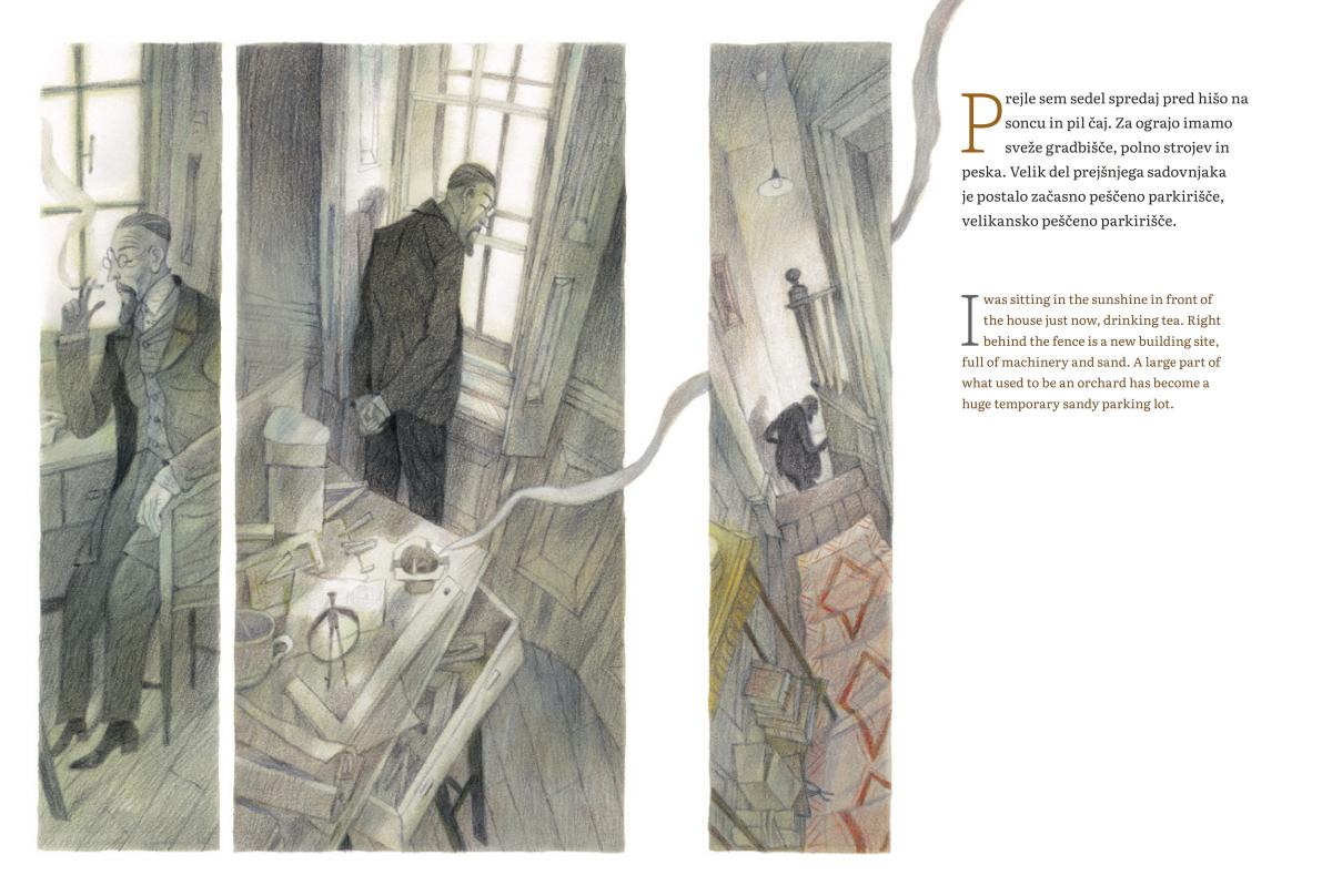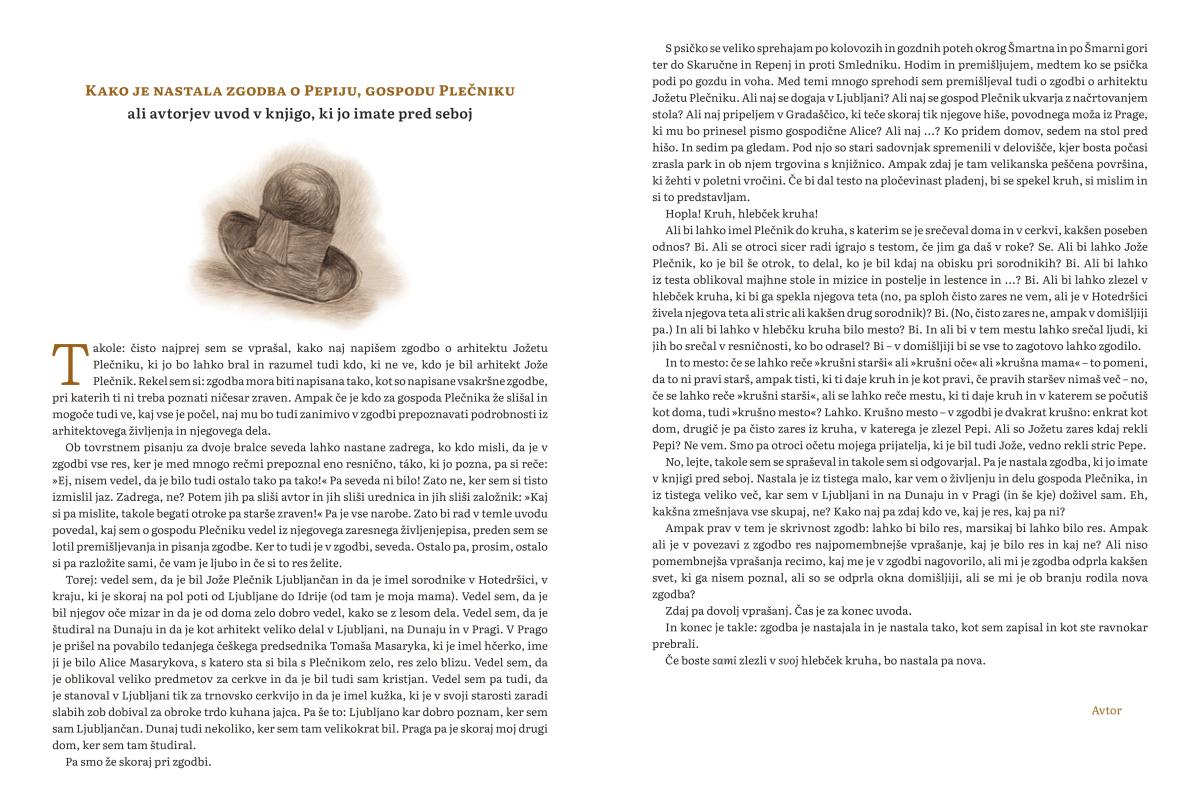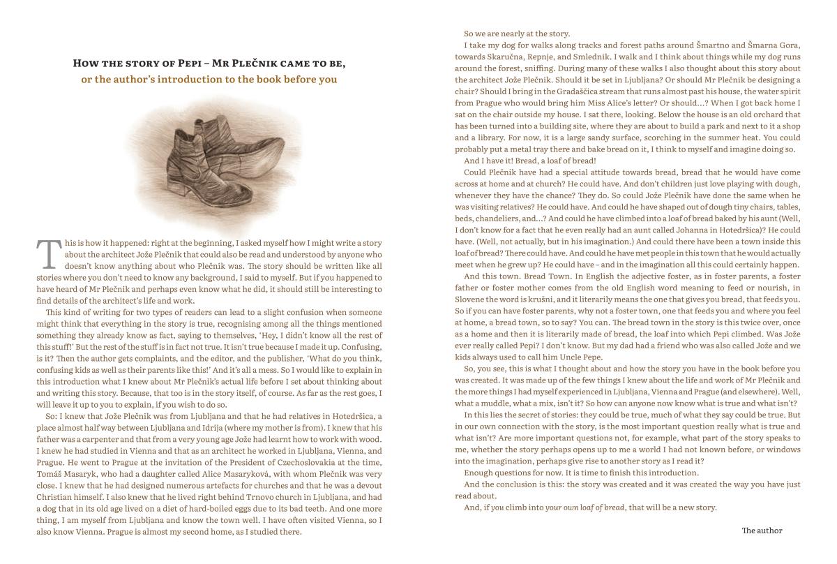 Bread town is not merely a fantasy tale about a young Plečnik who spends his holidays with his aunt. The book’s author Peter Svetina invites the reader into his creative workshop in an excellent introduction, and an expert on Jože Plečnik, Damjan Prelovšek, takes us through the life and work of the great architect. So, there are in fact as many as three stories in one book, including wonderful illustrations by another master of his craft.
