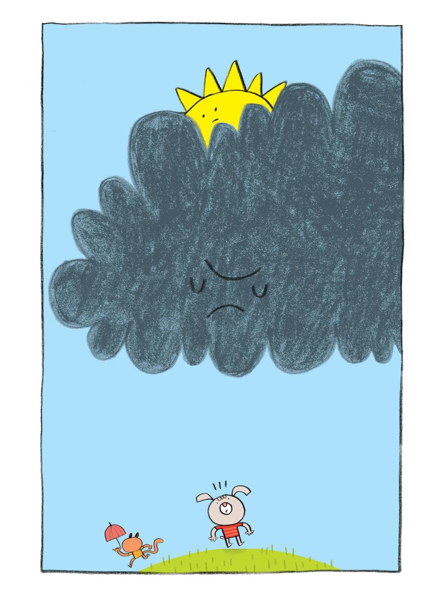 The forecast predicts a beautiful sunny day and Filip decides to go for a walk. But where is everyone running to with open umbrellas? And what does the big black cloud in the sky mean?